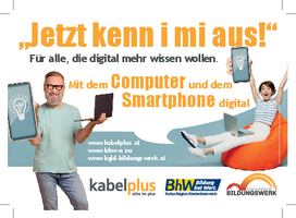 Bildformat 1748 x 1240 px Dieses Bild ist ein Inserat im Format A6-quer zur Ankündigung der Online-Workshopreihe des BhW zum Thema "Jetzt kenn i mi aus!" in der Gemeindezeitung. Es geht um Online-Workshops, die den Umgang mit Smartphones und PC´s erleichtern sollen. Es gibt hierzu auch einen allgemeinen Text im Word-Format auf der Download Area.
