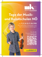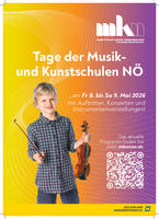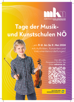Format A6-hoch - 105 x 148 (340 x 462 px) Dies ist ein Sujet im Format A6 hoch quer zur Ankündigung der Tage der Musik- und Kunstschulen am 8. und 9. Mai in ganz Niederösterreich. Vielleicht ist auch die Musik- oder Kunstschule Ihrer Gemeinde dabei. Die Tage der Musik- und Kunstschulen sind die Gelegenheit für die Bürgerinnen und Bürger mit Musik und Kunst in Verbindung zu treten und Anregungen für eine musisch-pädagogische Entwicklung zu erhalten. Helfen Sie mit, diese landesweite Aktion in Ihren Gemeindekanälen zu unterstützen!