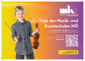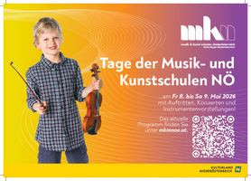 Format A6-quer - 148 x 105 (462 x 340 px) Dies ist ein Sujet im Format A6 quer zur Ankündigung der Tage der Musik- und Kunstschulen am 8. und 9. Mai in ganz Niederösterreich. Vielleicht ist auch die Musik- oder Kunstschule Ihrer Gemeinde dabei. Die Tage der Musik- und Kunstschulen sind die Gelegenheit für die Bürgerinnen und Bürger mit Musik und Kunst in Verbindung zu treten und Anregungen für eine musisch-pädagogische Entwicklung zu erhalten. Helfen Sie mit, diese landesweite Aktion in Ihren Gemeindekanälen zu unterstützen!