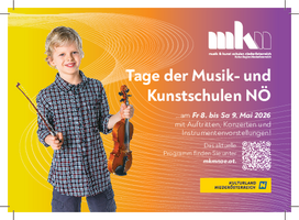 Format A5-quer - 210 x 248 (637 x 462 px) Dies ist ein Sujet im Format A5 quer zur Ankündigung der Tage der Musik- und Kunstschulen am 8. und 9. Mai in ganz Niederösterreich. Vielleicht ist auch die Musik- oder Kunstschule Ihrer Gemeinde dabei. Die Tage der Musik- und Kunstschulen sind die Gelegenheit für die Bürgerinnen und Bürger mit Musik und Kunst in Verbindung zu treten und Anregungen für eine musisch-pädagogische Entwicklung zu erhalten. Helfen Sie mit, diese landesweite Aktion in Ihren Gemeindekanälen zu unterstützen!