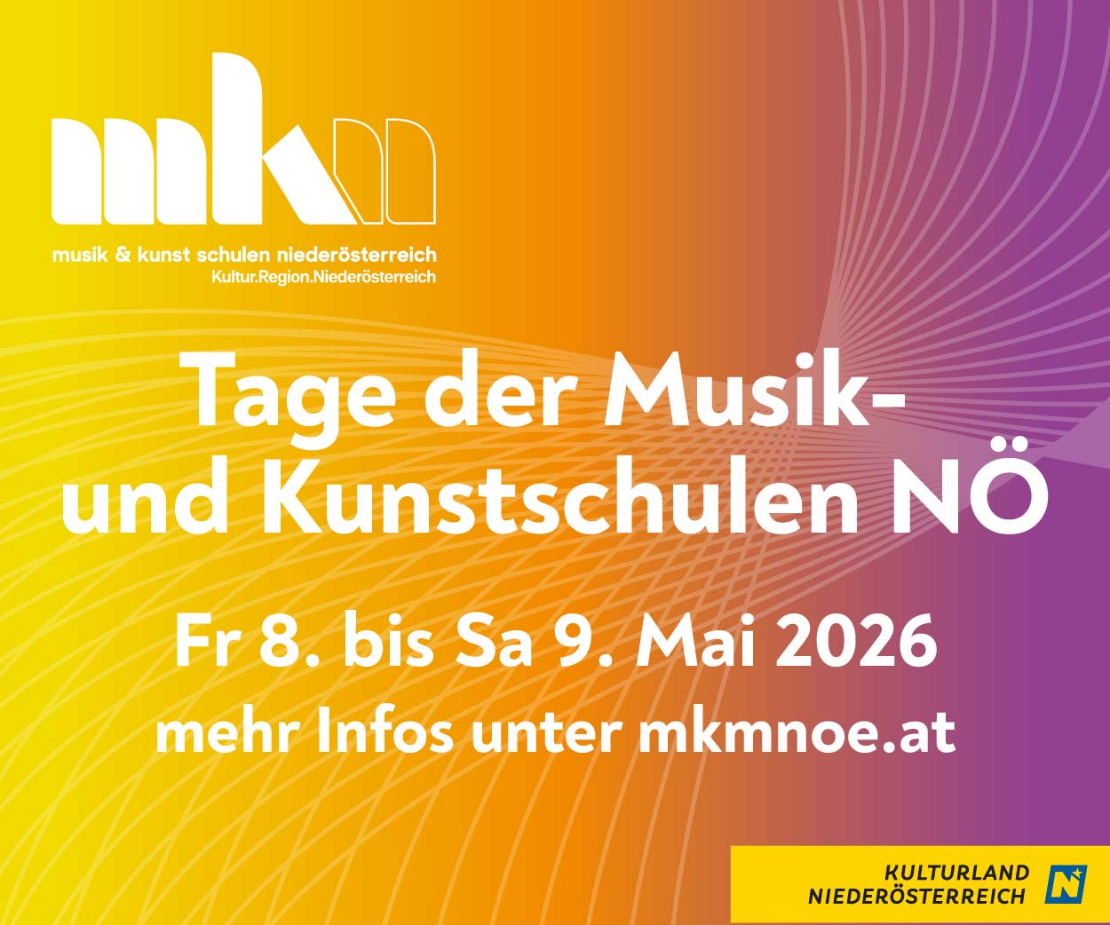 Format A4-quer - 297 x 210 (884 x 637 px) Dies ist ein Sujet im Format A4 quer zur Ankündigung der Tage der Musik- und Kunstschulen am 8. und 9. Mai in ganz Niederösterreich. Vielleicht ist auch die Musik- oder Kunstschule Ihrer Gemeinde dabei. Die Tage der Musik- und Kunstschulen sind die Gelegenheit für die Bürgerinnen und Bürger mit Musik und Kunst in Verbindung zu treten und Anregungen für eine musisch-pädagogische Entwicklung zu erhalten. Helfen Sie mit, diese landesweite Aktion in Ihren Gemeindekanälen zu unterstützen!