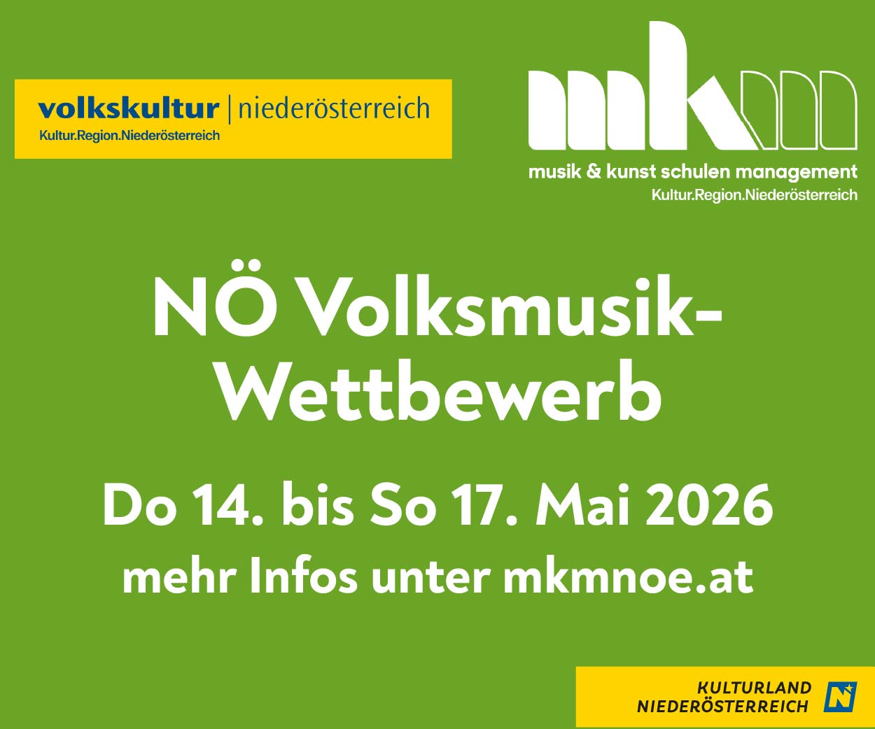 Banner im Format 468 x 60 / Von Donnerstag, 14. Mai, bis Sonntag, 17. Mai 2026 treffen sich junge Volksmusikerinnen und Volksmusiker im Haus der Regionen und der Ludwig Ritter von Köchel Musikschule in Krems, um beim Niederösterreichischen Volksmusikwettbewerb ihr Können zu zeigen. Auf der Plattform gibt es Sujets für die Ankündigung, Text und Bild für Ihre Gemeindekommunikation. Copyright: MKM NÖ
