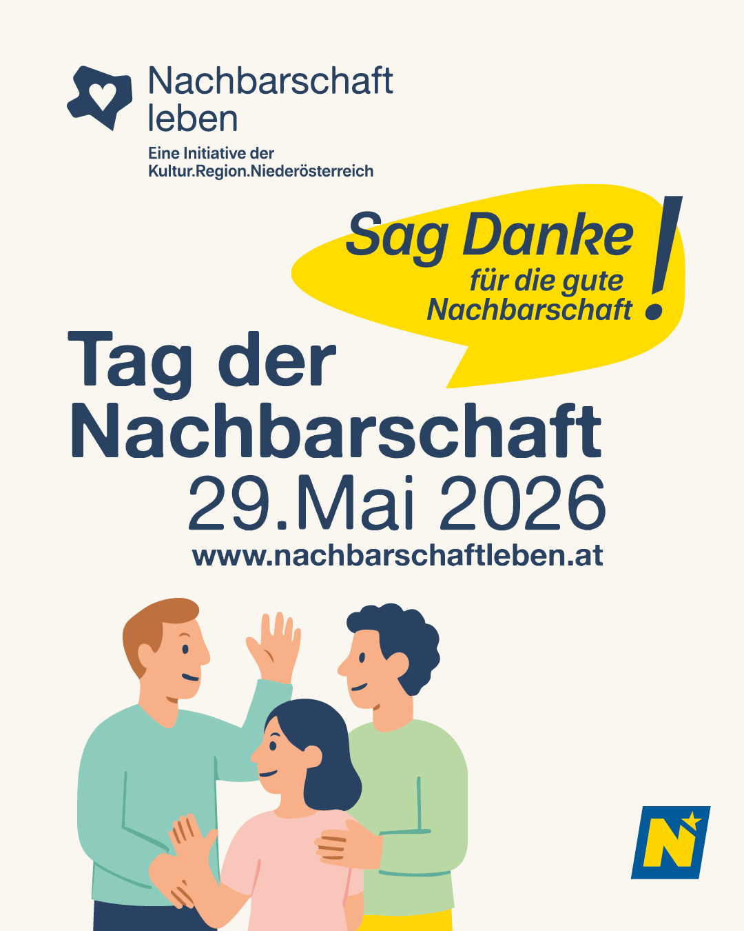 Format 1080x1350 px / WEB / Am 29. Mai ist der Tag der Nachbarschaft in ganz Niederösterreich! Unterstützen Sie diese Initiative für ein gutes Miteinander und laden Sie Ihre Sujets für Ihre Kommunikationskanäle kostenfrei herunter! Dieses Sujet ist für die Website gedacht.