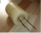 Adventkranz binden_Schritt 5: Den Steckdraht in drei gleichgroße Teile zurechtschneiden. Mit einer Zange vorsichtig ein Ende in eine Kerzenflamme halten und - sobald dieses erhitzt ist, in die Unterseite der Kerze stecken. (169 x 137 px)