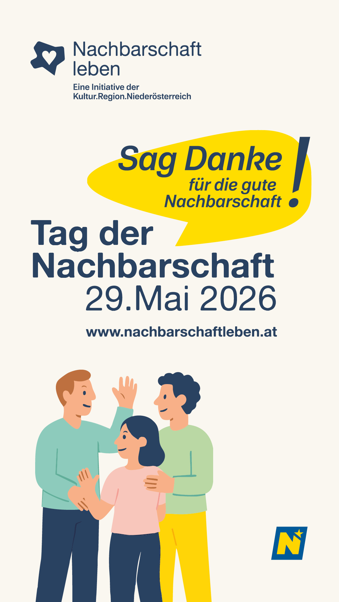 Format 1080x1920 px / WEB / Am 29. Mai ist der Tag der Nachbarschaft in ganz Niederösterreich! Unterstützen Sie diese Initiative für ein gutes Miteinander und laden Sie Ihre Sujets für Ihre Kommunikationskanäle kostenfrei herunter! Dieses Sujet ist für die Website gedacht.. In der Suche unter "Nachbarschaft", oder über den Quick-Link werden alle verfügbaren Sujets bereitgestellt.