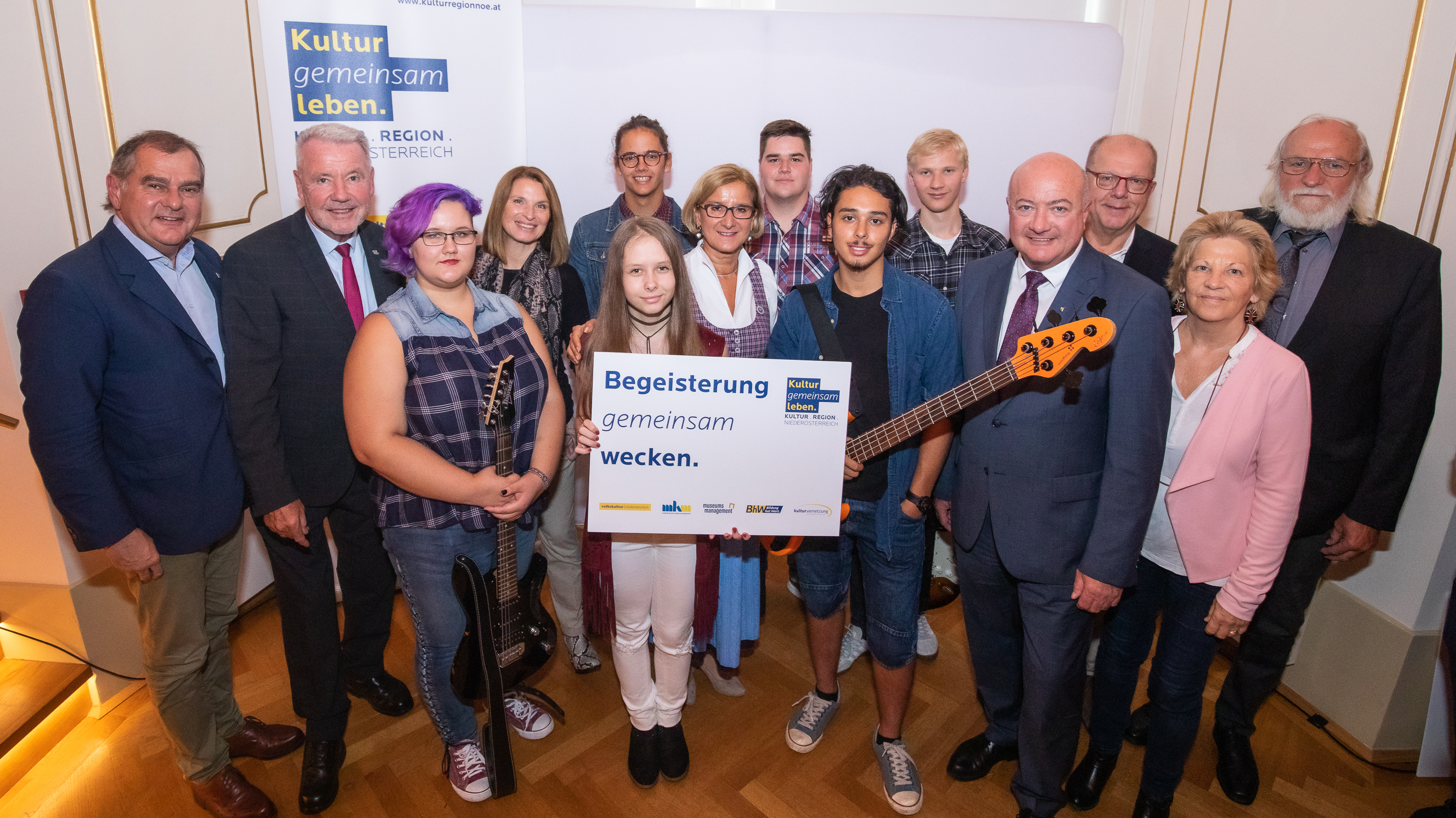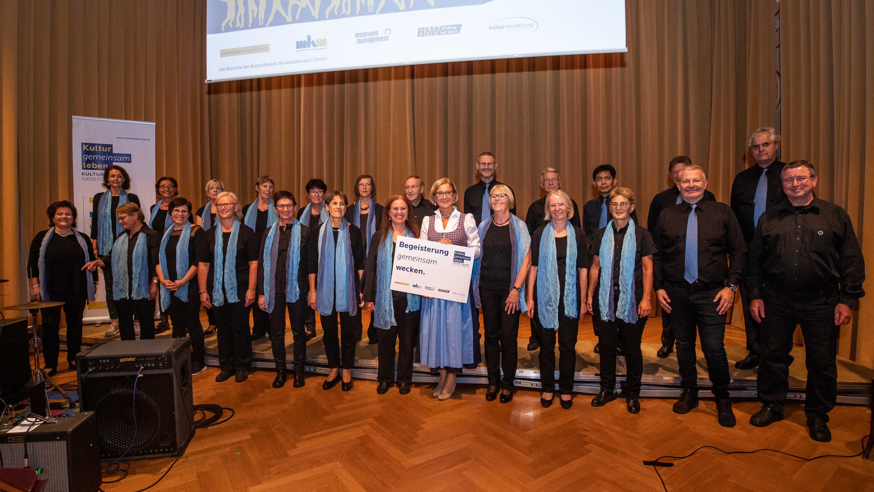 Landeshauptfrau Johanna Mikl-Leitner, Bürgermeister Klaus Scheneeberger und Barbara Stöckel feierten mit Ehrenamtlichen und dem Musikensemble The Cyrus & Cash Connection aus der Region Wiener Neustadt. 2. Reihe: v.l.n.r. Franz Dinhobl, Bürgermeister Klaus Schneeberger, TV-Moderatorin Barbara Stöckl, Sebastian Holzer, Manuel Fornix und Felix Tauber von The Cyrus & Cash Connection, Robert Prazak (Zinnfigurenwelt Katzelsdorf), Rudolf Fleischmann (Sagenerzähler), 1. Reihe: v.l.n.r. Alexa Michelle, Nicole Scheibenreif (The Cyrus & Cash Connection), Landeshauptfrau Johanna Mikl-Leitner, Julio Ruix-Zapata, Vizebürgermeister Christian Stocker, Renate Seemann (Eumig Museum) copyright: Monika Fellner